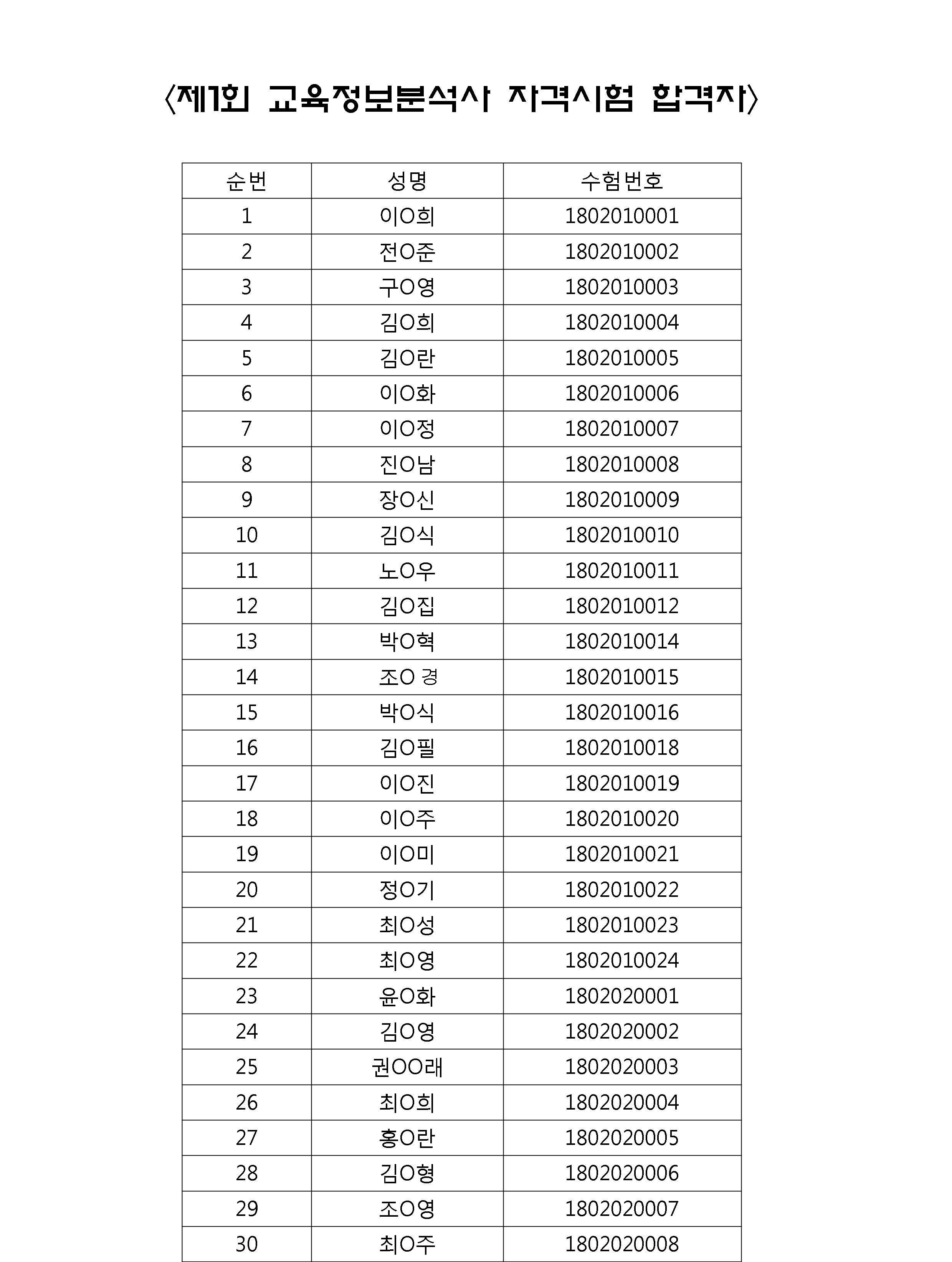 Á¦1ȸ ±³À°Á¤º¸ºÐ¼®»ç ÀڰݽÃÇè ÇÕ°ÝÀÚ ¸í´Ü ¾È³»(ÀÚ°ÝÁõ¹ß±Þ½Åû¼ ÷ºÎ)